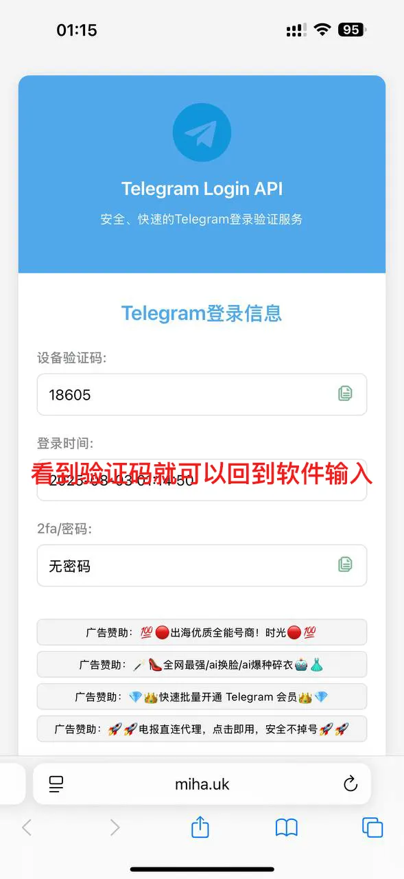 前面 +60 1163795282  为手机号码,打开VPN输入后接收验证码页面在复制  https://miha.uk/tgapi/9Dcq3vMrd2Ua4uWB/33c77e88-eabe-4e4b-80da-635435df76c6/GetHTML  去浏览器打开接收验证码输入即可